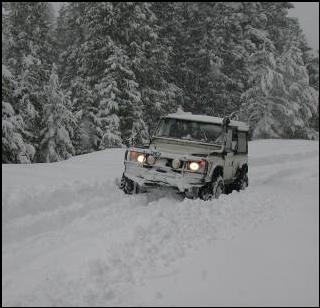 One of our customers off-roading in the Sierras during a blizzard with 3 of snow on his Badger canvas top. |